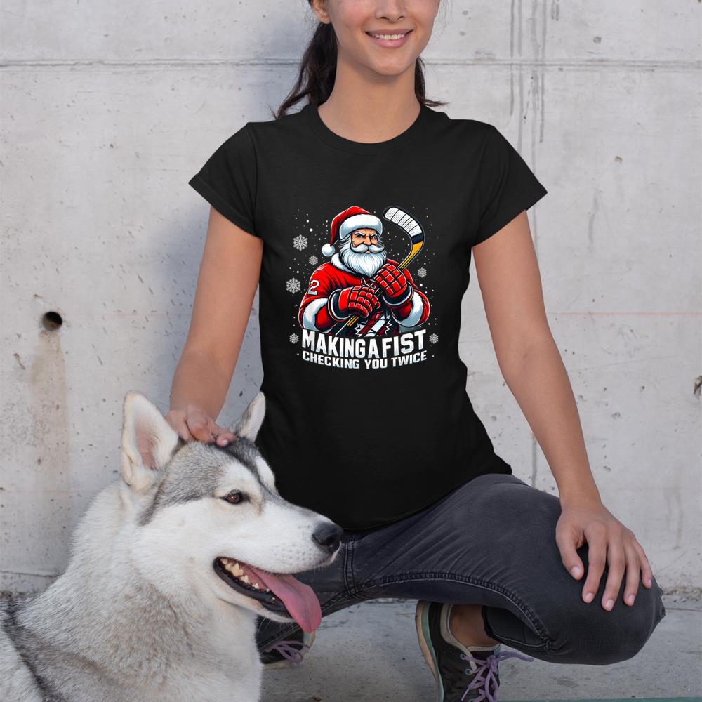 Xmas Santa Hockey Players Making A Fist Checking Your Twice T-Shirt
